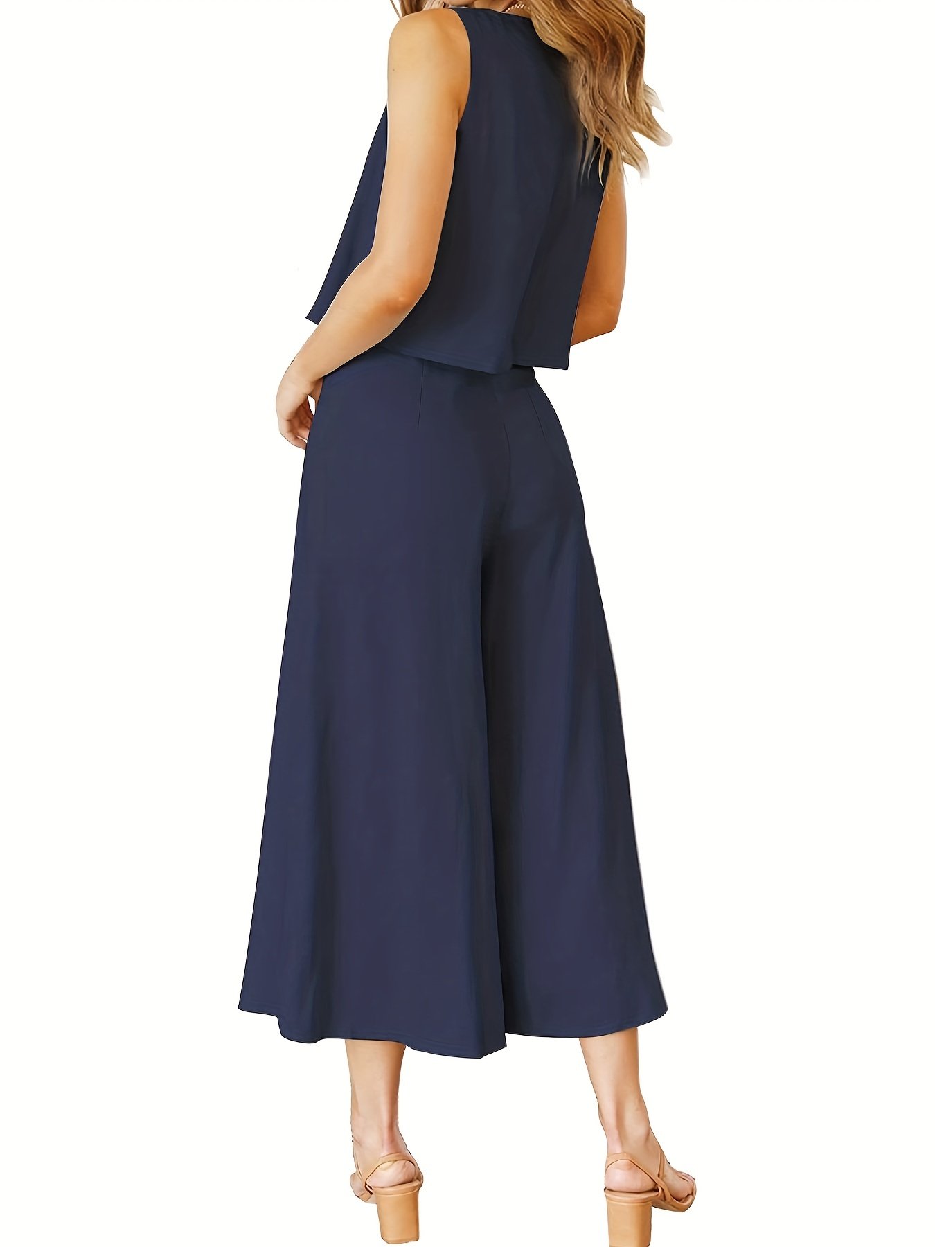 Casual Solid Two-piece Set, Crew Neck Tank Top & Wide Leg Pants Outfits, Women’s Clothing