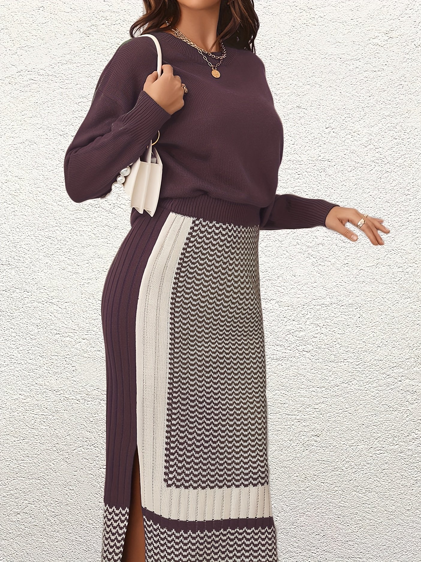 Elegant Sweater Two-piece Set, Solid Long Sleeve Knit Sweater & Split High Waist Skirts Outfits, Women’s Clothing