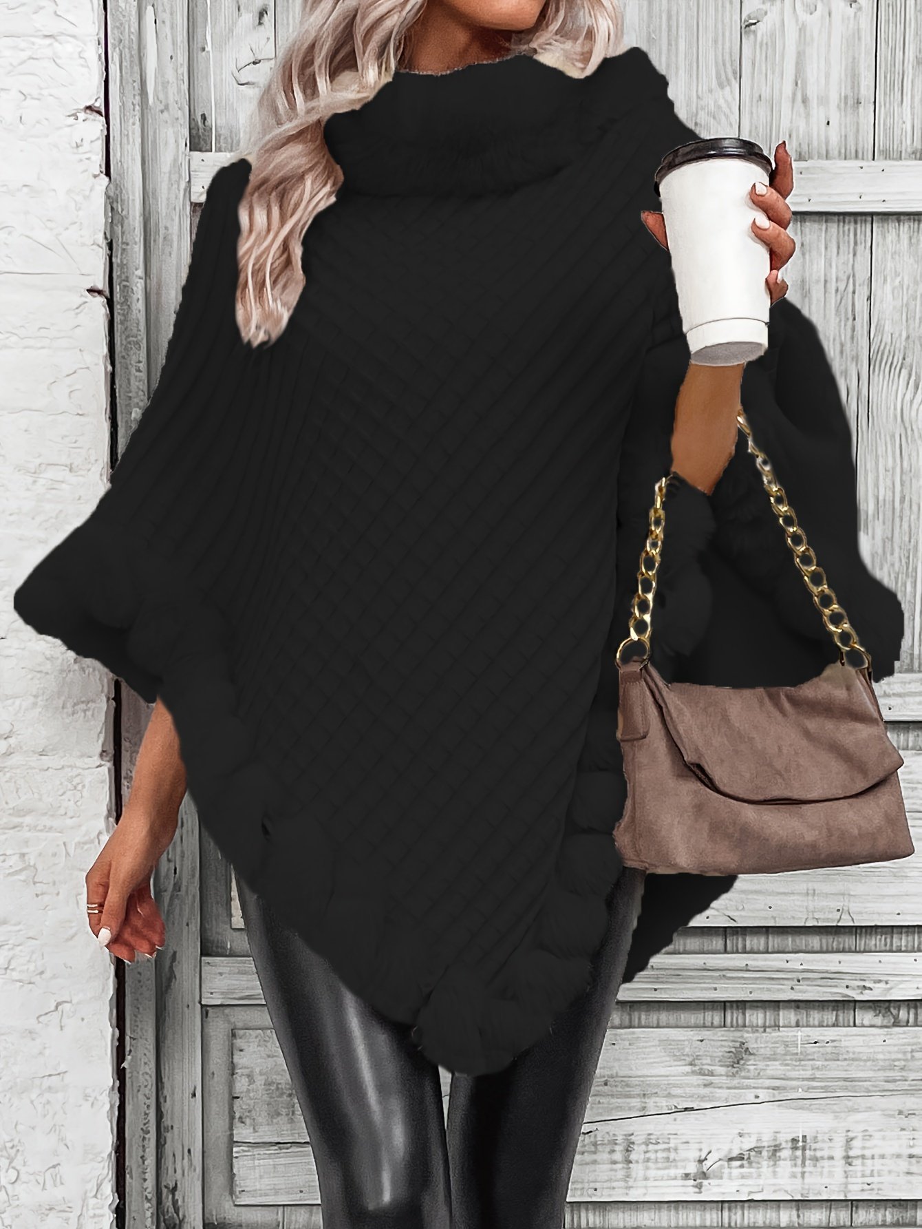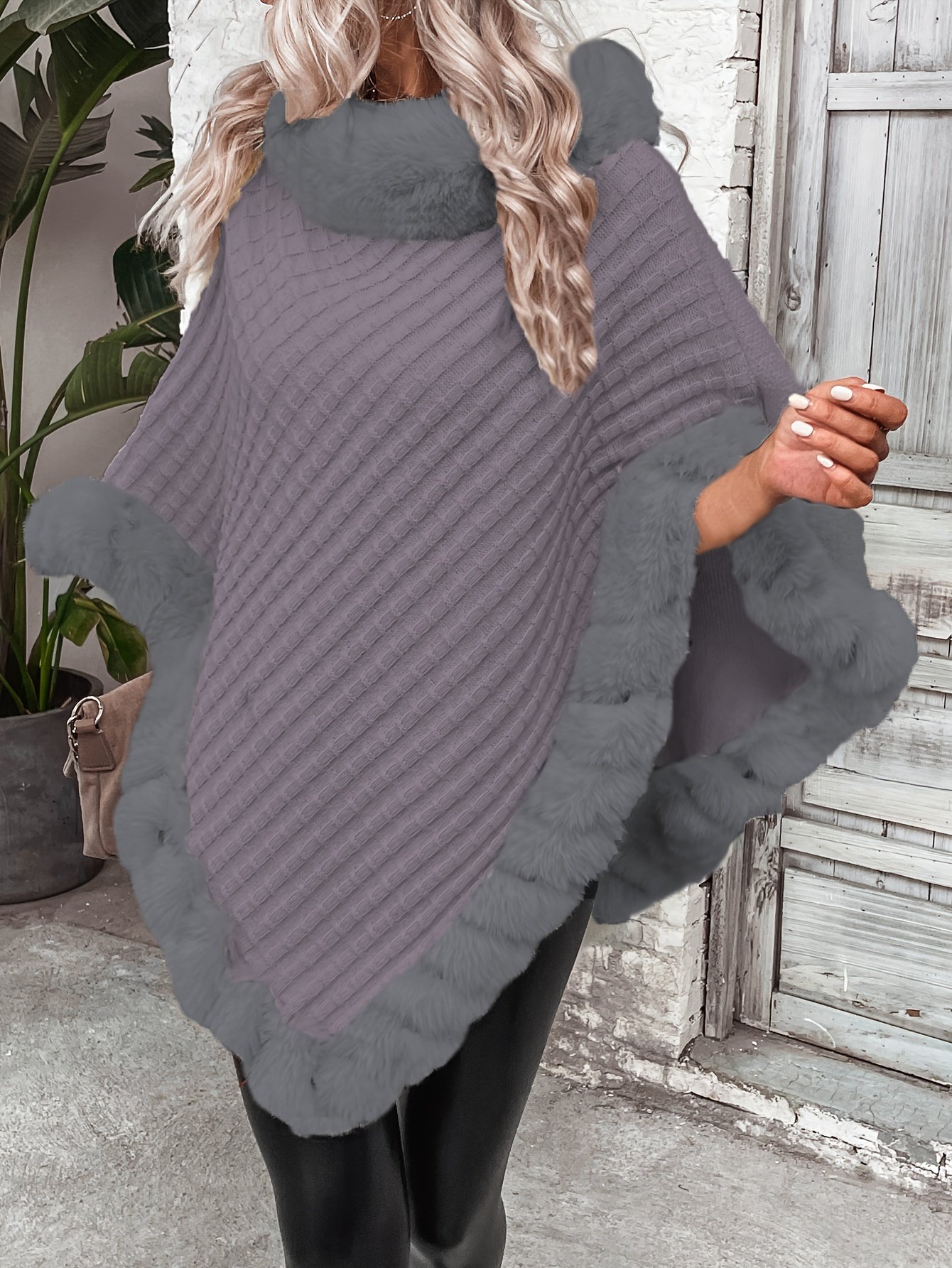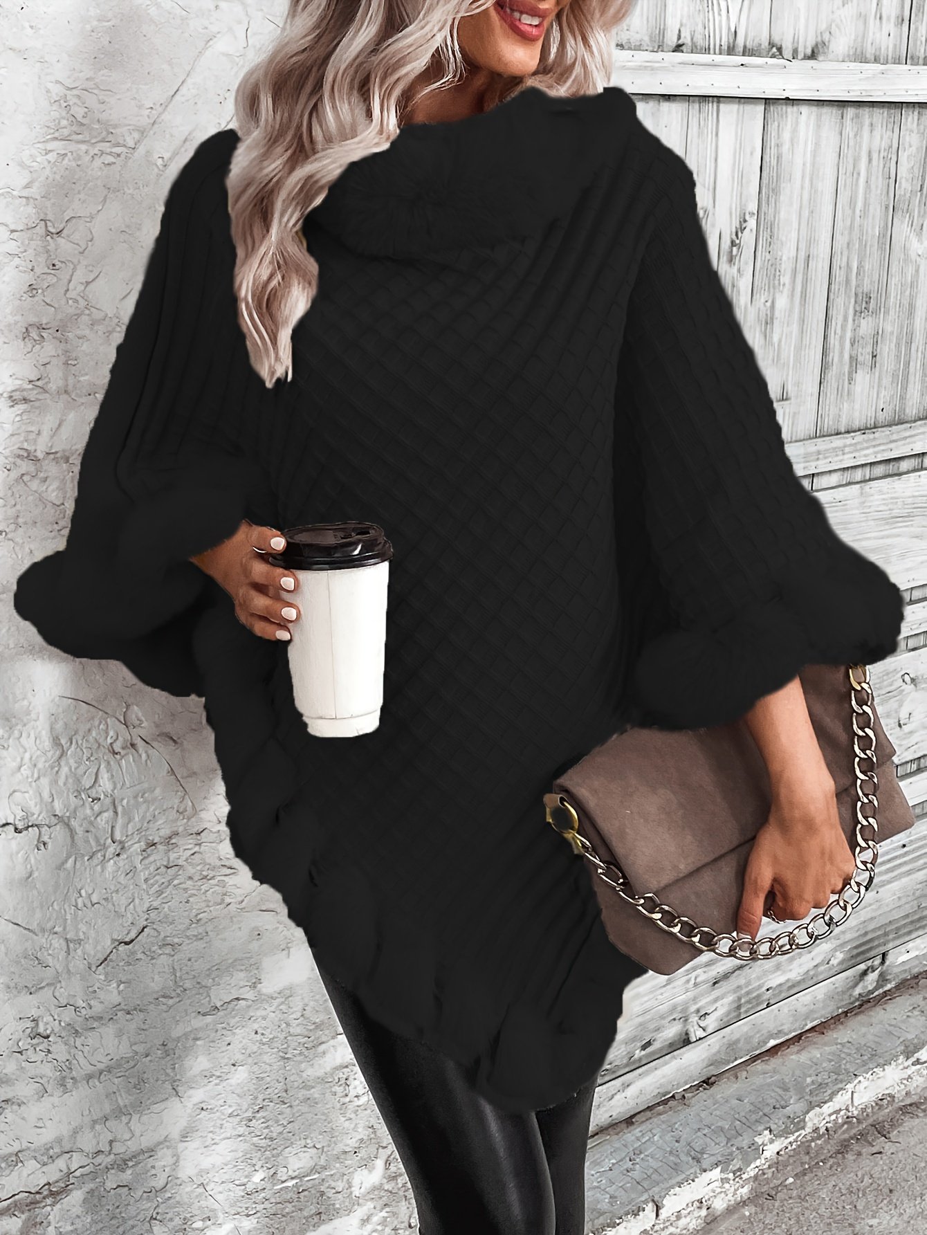 Fur-Trim Hanky Hem Pullover Sweater, Elegant Long Sleeve Turtle Neck Sweater For Winter, Women’s Clothing