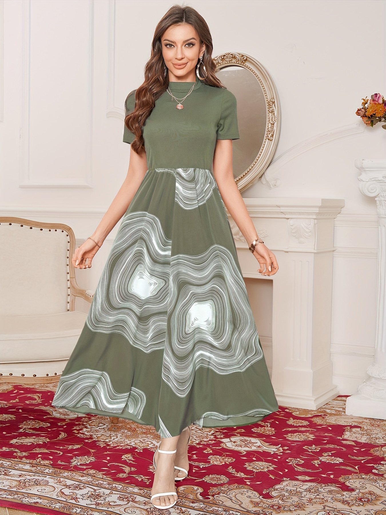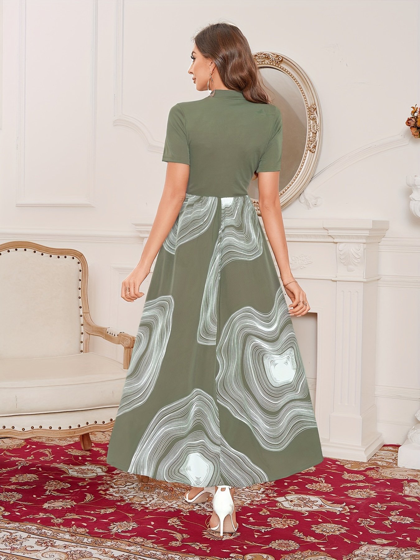 Be the first to review “Graphic Print Splicing Aline Dress, Vintage Mock Neck Short Sleeve Dress, Women’s Clothing”
