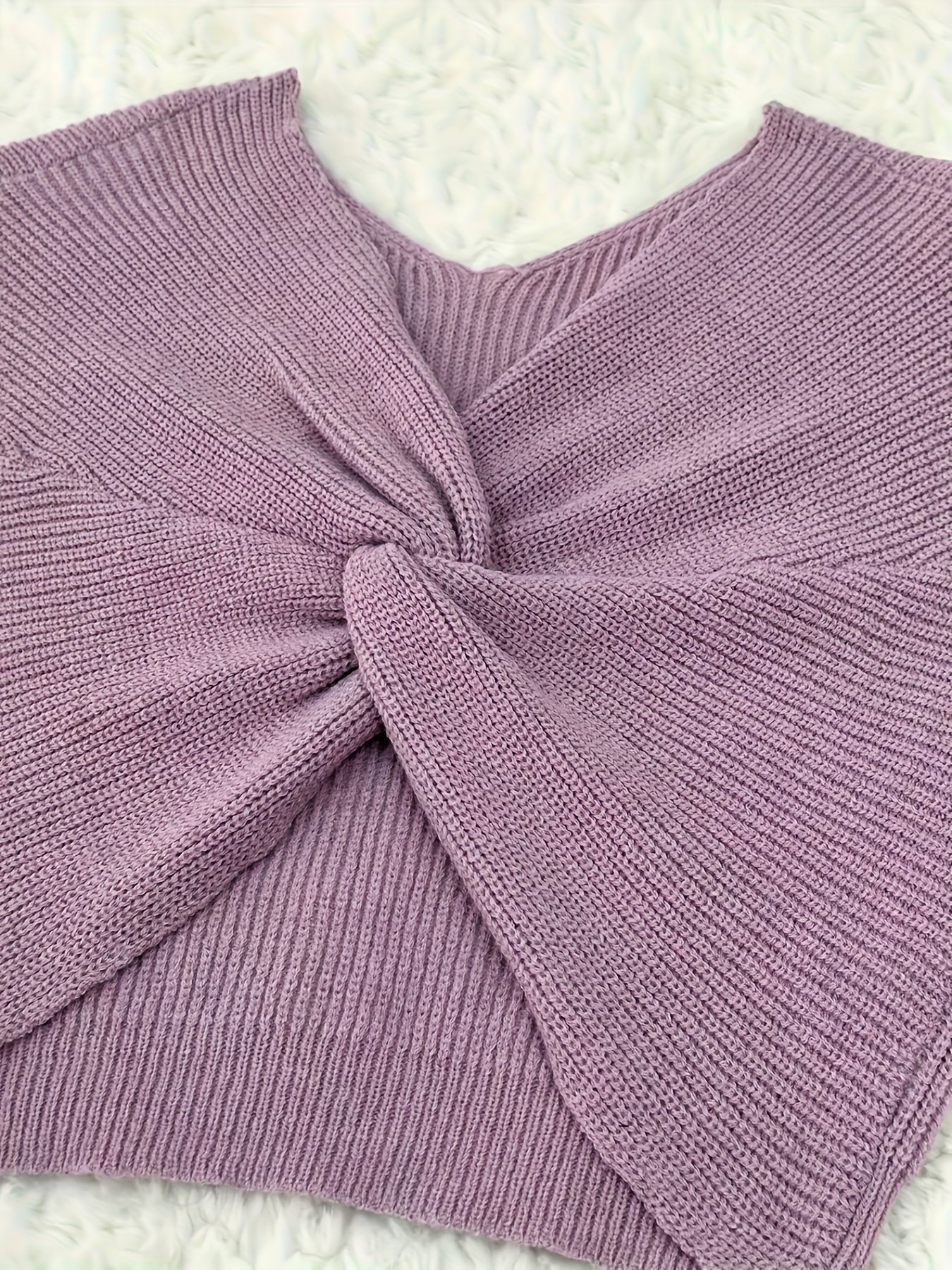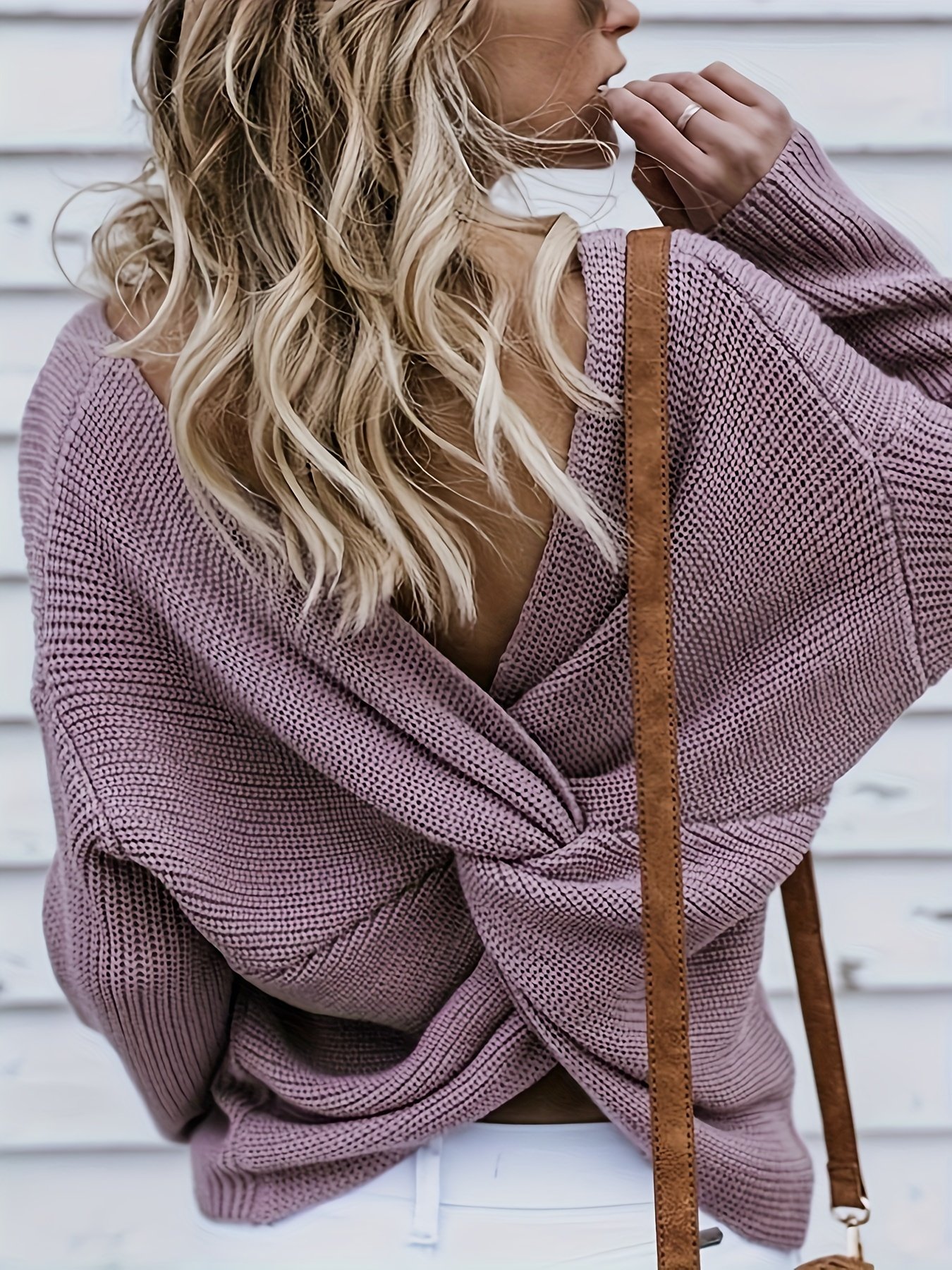 Solid Twist Back Pullover Sweater, Elegant Backless Long Sleeve Sweater, Women’s Clothing