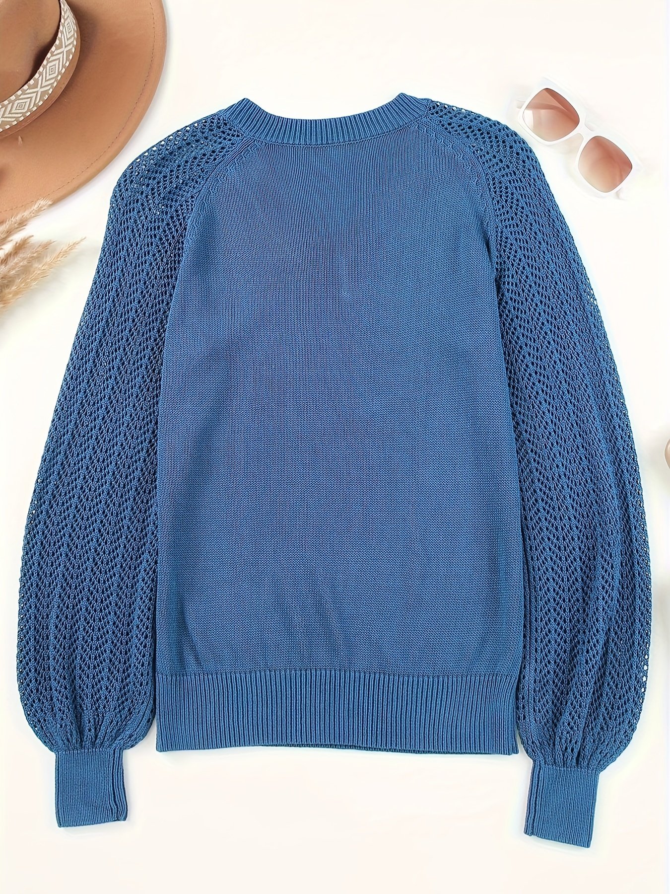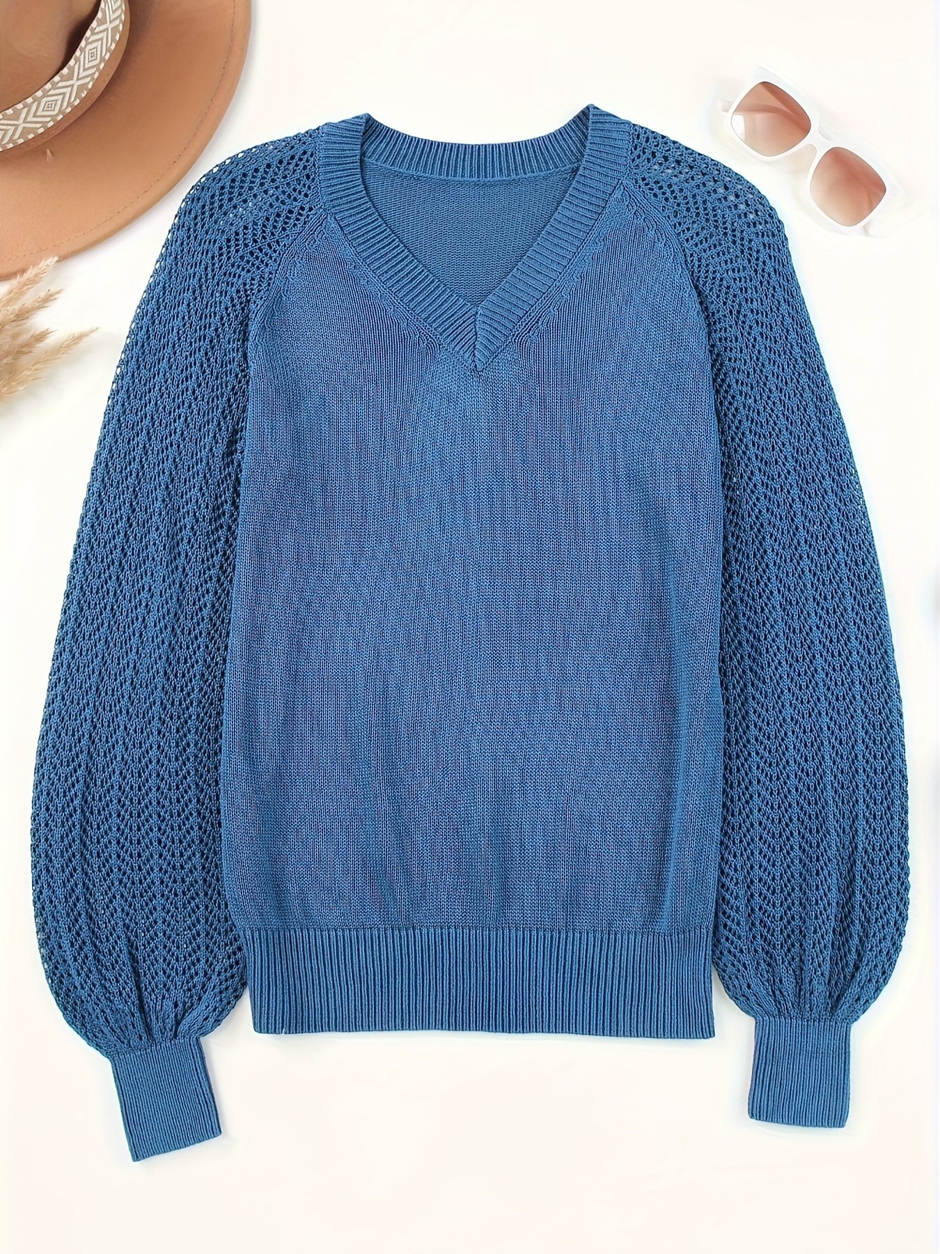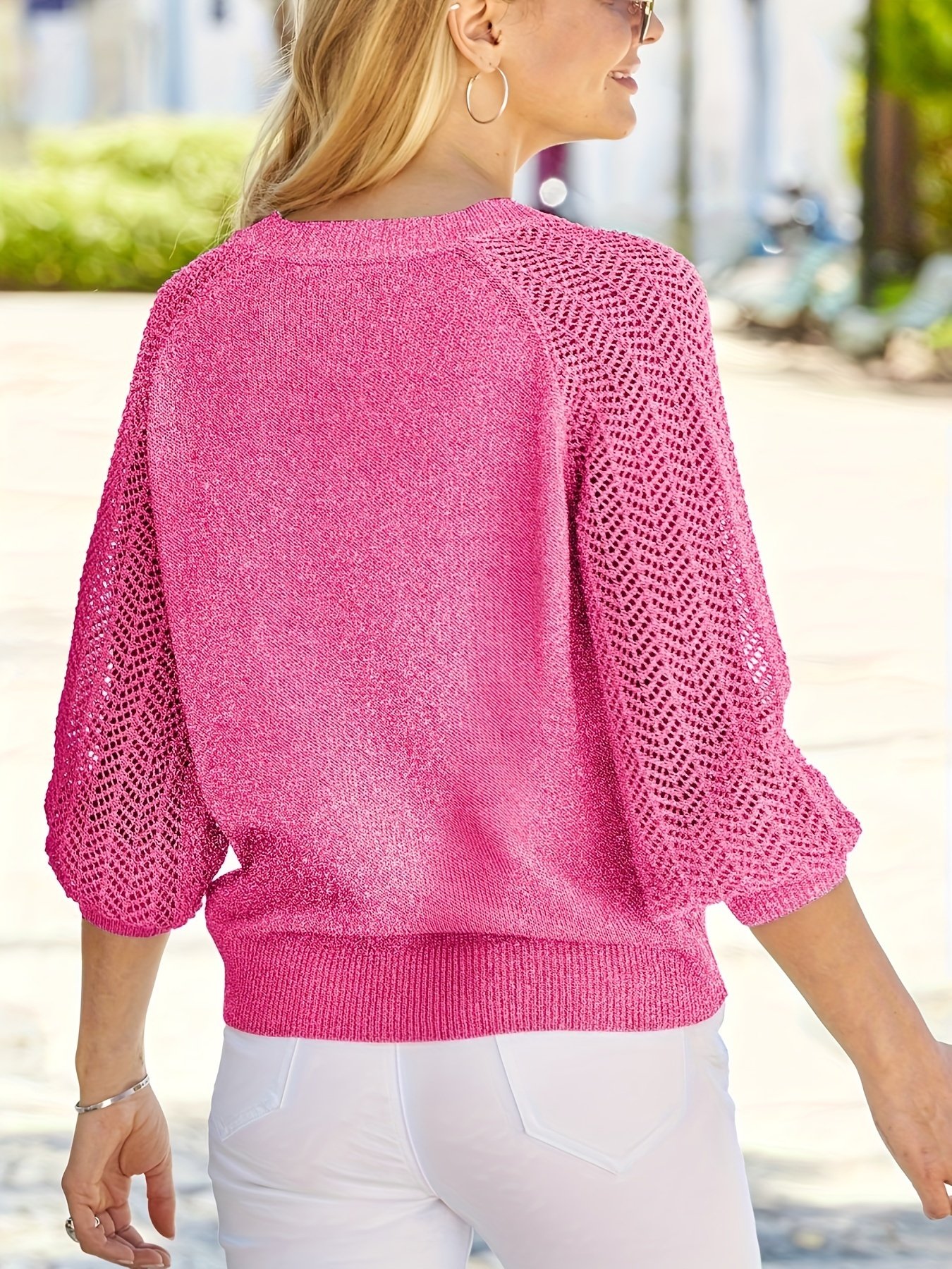 Solid V Neck Pointelle Knit Sweater, Casual 3/4 Sleeve Loose Sweater, Women’s Clothing