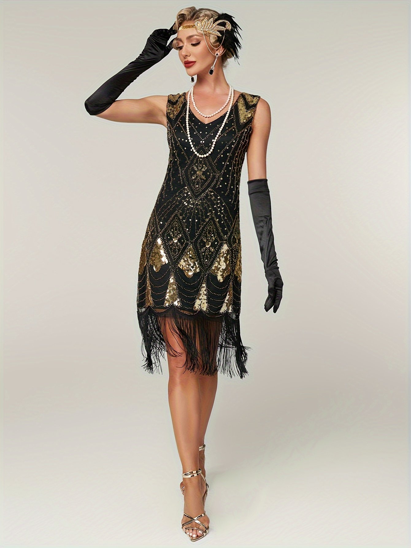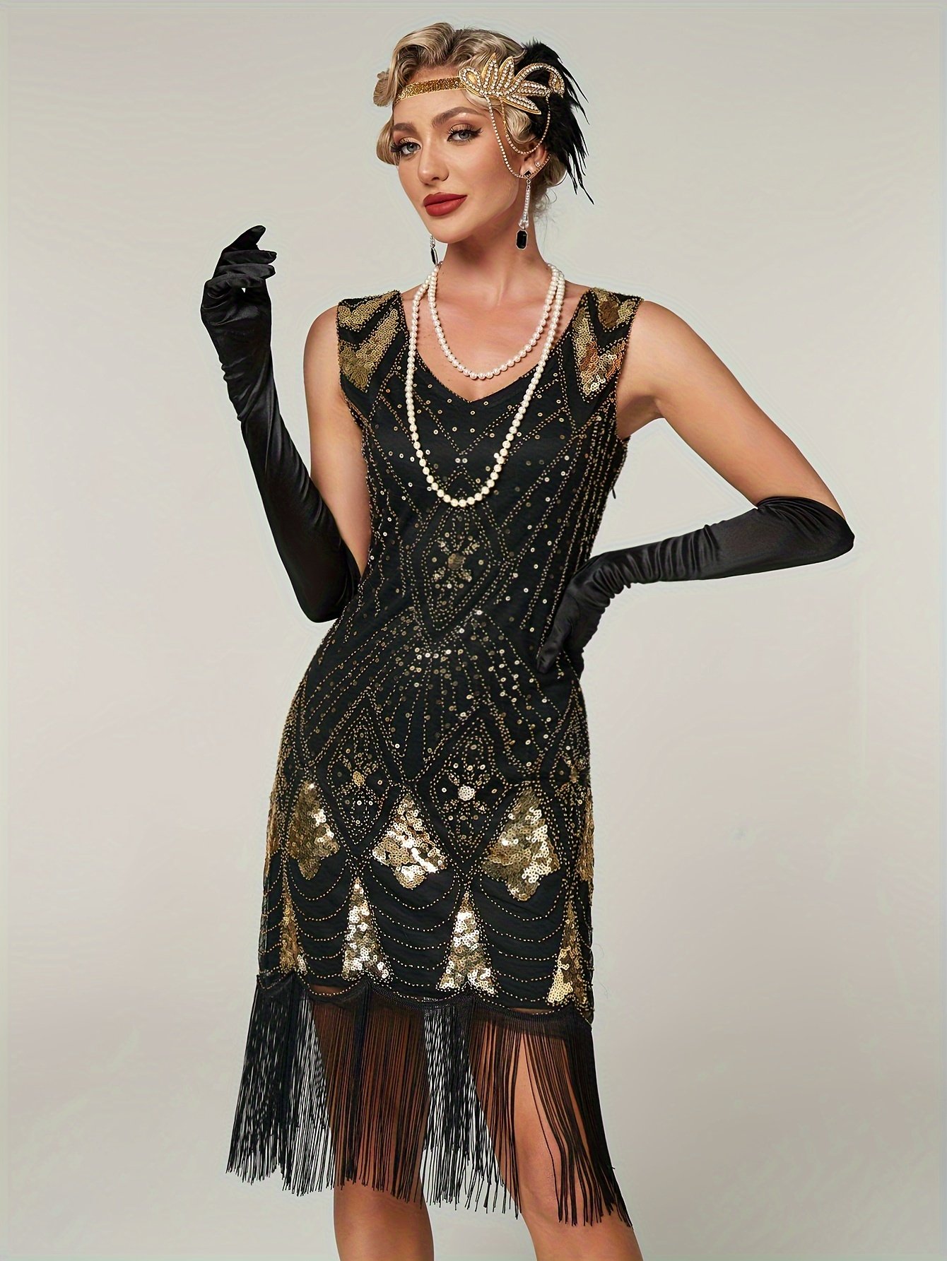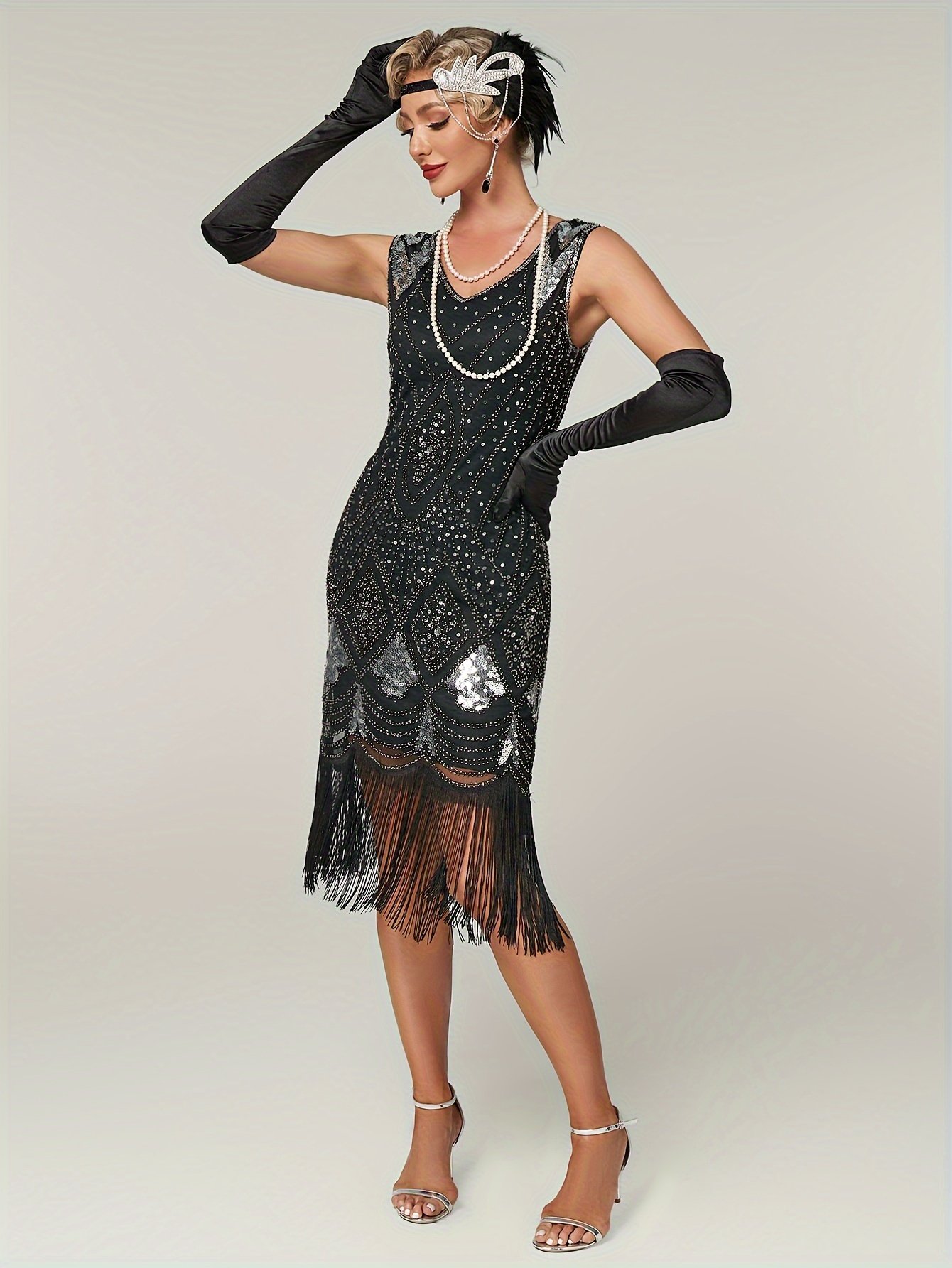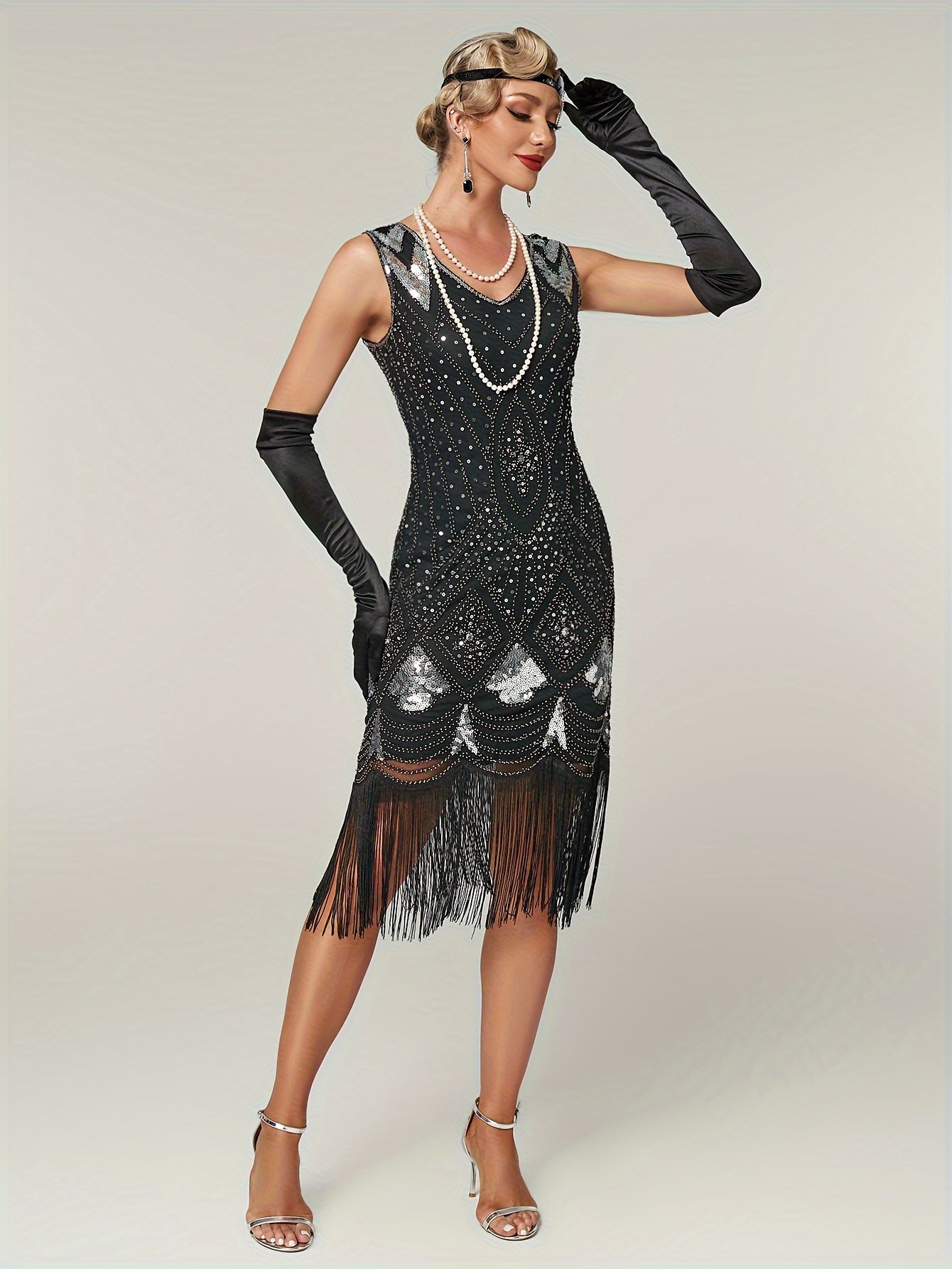 Sparkling Sequin V Neck Dress, Elegant Sleeveless Sheath Fringe Hem Dance Dress For Party & Club, Women’s Clothing